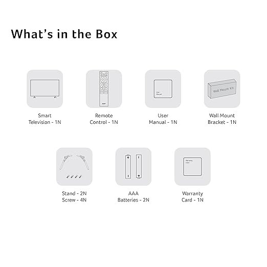 | Included Components | 1 TELEVISION | 1 REMOTE CONTROL | 2 TABLE STANDS | 4 SCREWS | 1 WALL MOUNT KIT |