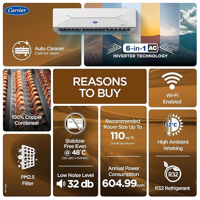 - Split AC with Flexicool inverter Technology : Variable speed compressor which adjusts power depending on heat load | with Flexicool Convertible 6-in-1 inverter technology where user can increase or decrease cooling capacity and saves upto 50%* energy consumption.