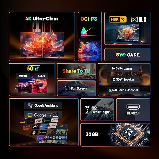 Resolution : 4K UHD TV (3840 x 2160) I Google TV I 60 Hz Refresh Rate