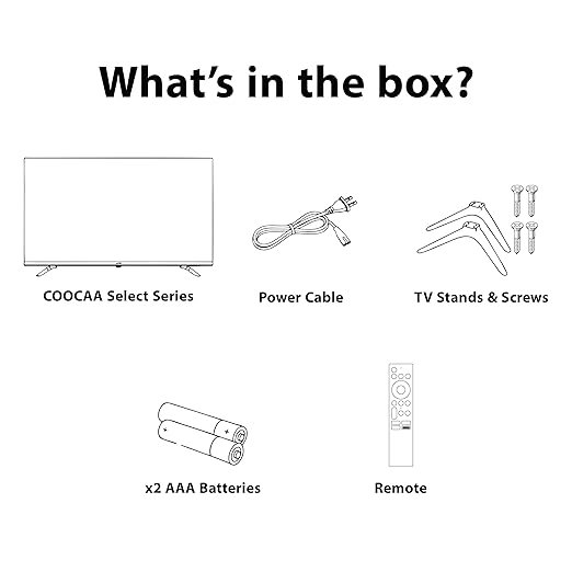 TV Unit-1N, Stand Bases-2N, Quick Start Guide-1N, Warranty Card 1N, Remote-1N, Batteries-2N, Power cord-1N,Screws-4N, AV Converting Cable-1NTV Unit-1N, Stand Bases-2N, Quick Start Guide-1N, Warranty Card 1N, Remote-1N, Batteries-2N, Power cord-1N,Screws-4N, AV Converting Cable-1N