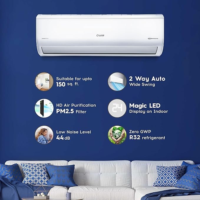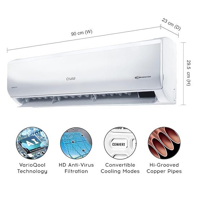 - Split AC with inverter compressor: Variable tonnage technology for faster cooling that adjusts power depending on cooling requirement