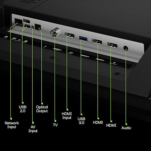 • Connectivity: WiFi 2.4GHz/5GHz 802.11a/b/g/n/ac | Bluetooth 5 | HDMI 2.1 x 3 (1 with eARC) | HDMI Bandwidth 48Gbps | 1 AV Input Mini | 1 Digital Audio Output Optical | 3.5mm Audio Output Supports upto 300Ω load | USB 3.0 x1, USB 2.0 x2 | Ethernet RJ45 x1 (100Mbps)
