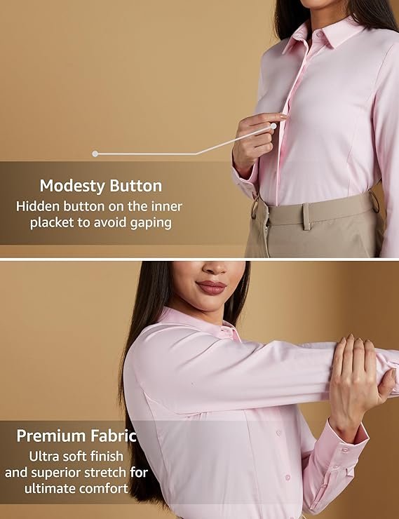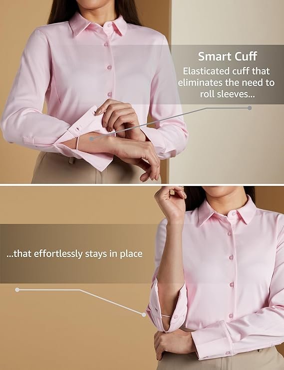 - FUNCTIONALITY: It features smart cuffs on the sleeves that effortlessly scrunch up and stay securely in place. The front placket includes a discreet modesty button to prevent any gaping