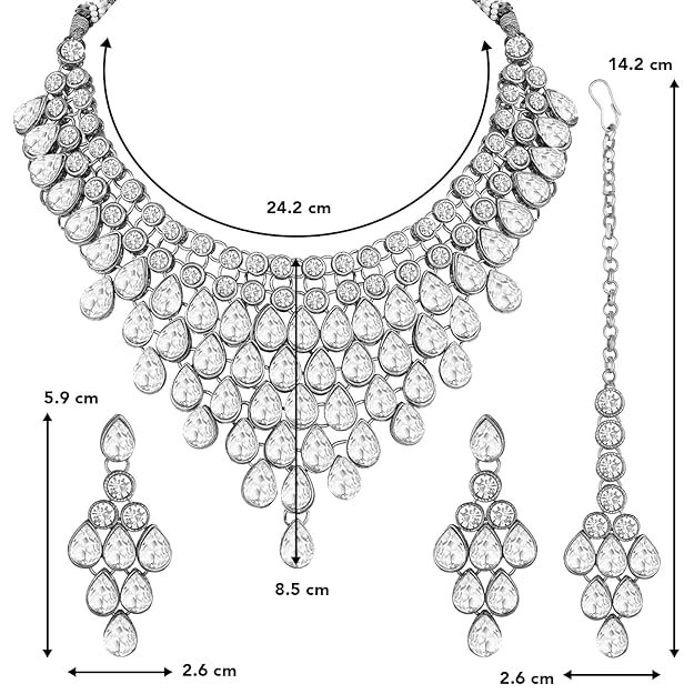 • DIMENSIONS: Necklace Length: 24.2 cm x Width: 8.5 cm; Earrings Length: 5.9 cm x Width: 2.6 cm; Maangtikka Length: 14.2 cm x Width: 2.6 cm; Weight: 171 grams